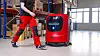Der RA660 Navi XL mit 3D-Ultraschallsensorik reinigt autonom in einem Lagergang und bewegt sich sicher neben einem Mitarbeiter.Cleanfix